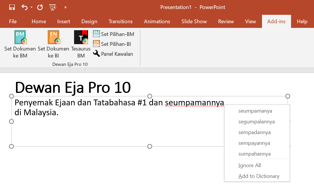 Dalam MS PowerPoint 2007, 2010, 2013, 2016 dan 2019, reben Dewan Eja Pro 10 berada dalam tab Add-Ins.