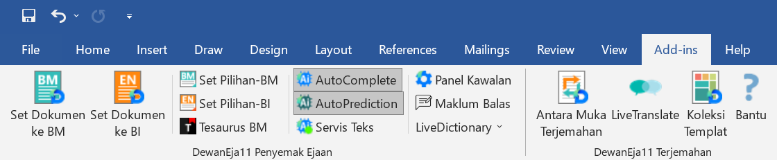Dewn Eja11 berintegrasi dengan MS Word 2016, 2019 dan 2021. Dalam MS Word, reben DewanEja11 berada pada tab Add-Ins.